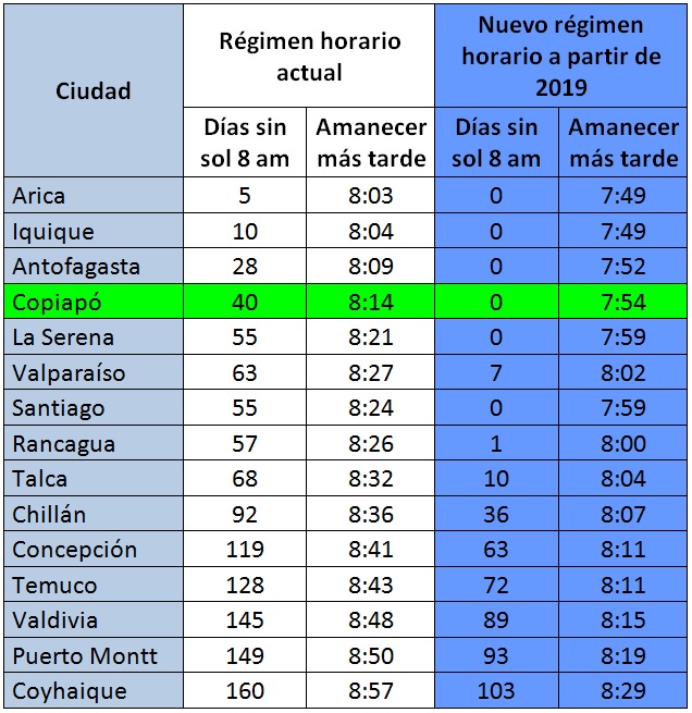 “Hemos decidido como Gobierno que a partir de 2019 se aumentará a cinco meses el horario de invierno (UTC -4), del primer sábado de abril al primer sábado de septiembre. Esto permitirá tener más luz en las mañanas. Por ejemplo, en Copiapó, con el régimen actual, tenemos 40 días sin sol antes de las 08.00 am, el sol sale en promedio a las 08.14 horas, en cambio con el nuevo huso los días sin sol antes de las 08:00 am se reducen a cero, y en promedio el sol aparecerá a las 07:54 horas”, explicó el seremi de Energía, Marcelo Sepúlveda Gárate.