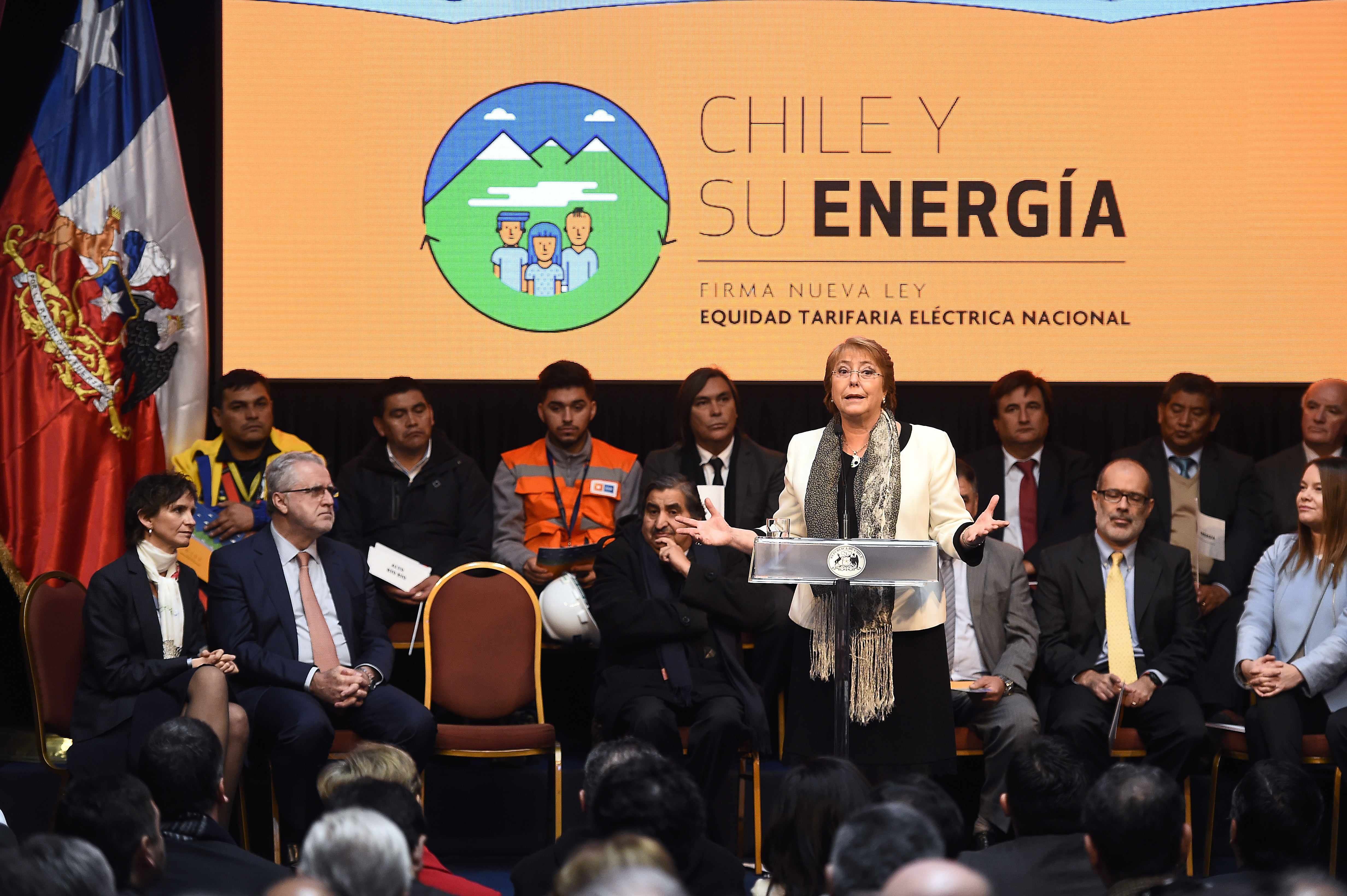 La Presidenta de la República, Michelle Bachelet, acompañada por los ministros de Hacienda, Rodrigo Valdés; de Energía, Máximo Pacheco; y de Bienes Nacionales, Víctor Osorio, promulgó esta mañana la Ley de Equidad Tarifaria, que introduce mecanismos para disminuir las diferencias de precios entre las cuentas de electricidad a nivel país.