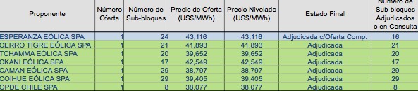 ,En esta licitación –en la que participaron 84 empresas oferentes- se adjudicó a un precio medio de 47,6 US$/MWh, incorporándose nuevos actores al mercado eléctrico, de los cuales 2/3 proviene de tecnologías eólicas y solares.