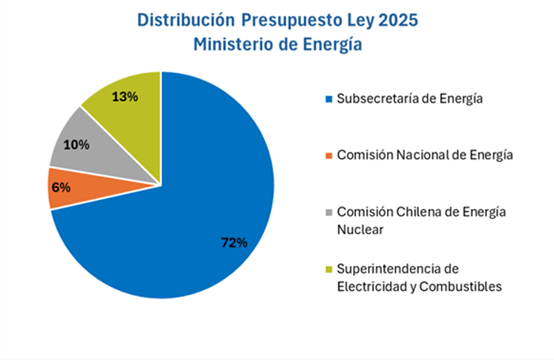 La Ley de Presupuestos del Sector Público correspondiente al año 2025 - N°21.722, asigna a la Partida 24 - Ministerio de Energía un presupuesto total de M$148.624.042. De este total, M$106.304.339 corresponde al presupuesto del Capítulo 01 - Subsecretaría de Energía, el cual equivale a un 72% del presupuesto total del Ministerio. El 28% restante, concentra el presupuesto del resto de los Servicios que conforman el Ministerio: Capítulo 02 - Comisión Nacional de Energía, Capítulo 03 - Comisión Chilena de Energía Nuclear y el Capitulo 04 - Superintendencia de Electricidad y Combustibles.