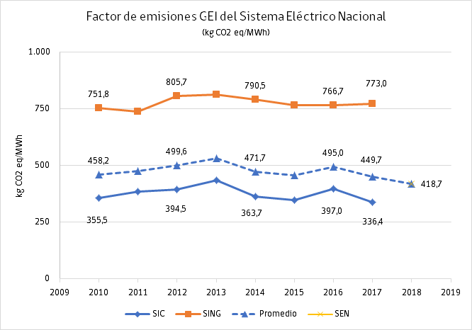 | Descripción | Gráfico muestra el factor de emisiones GEI del Sistema Eléctrico Nacional (SEN), expresado en kilogramos de CO2 equivalente por MWh generado. |