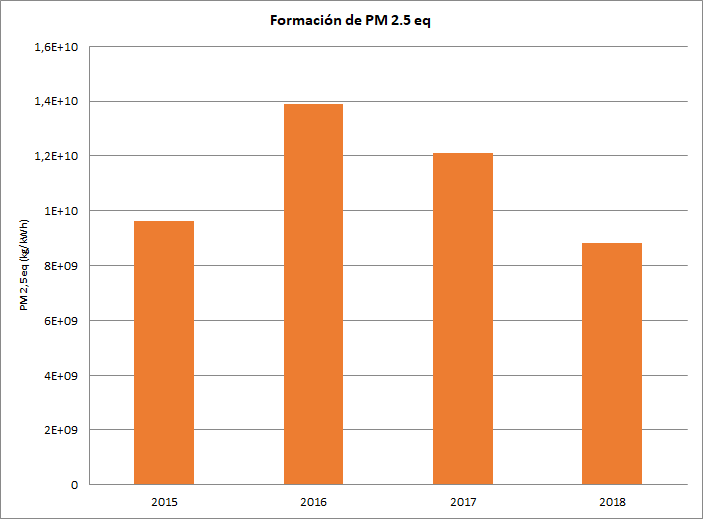 Este indicador muestra la evolución en el tiempo de la formación material particulado fino (MP 2.5). El MP 2.5 es la fracción más pequeña del MP, con diámetro menor o igual a 2.5 micrómetros. Este indicador es relevante, ya que al ser la fracción más fina del MP es más perjudicial para la salud ya que ingresa con mayor facilidad a cavidades más profundas del sistema respiratorio. Este indicador expresa tanto el MP2.5 emitido directamente (MP primario) por las centrales térmicas a gas, diésel y carbón, como el MP2.5 secundario, que se forma en la atmósfera producto de las reacciones de contaminantes gaseosos como el NOx y SO2, se calcula de acuerdo a la metodología establecida en ReCiPe(1) y se muestra en kg de MP 2.5 equivalente (MP primario y secundario) por unidad de generación eléctrica (kWh) generado por estas mismas centrales.