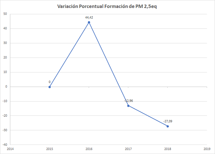 Descripción Un gráfico que muestre la evolución en el tiempo del indicador de categoría de impacto "Formación material particulado fino (kg PM2.5 equivalente/kWh)" y un gráfico que representa la variación porcentual del período estudiado.