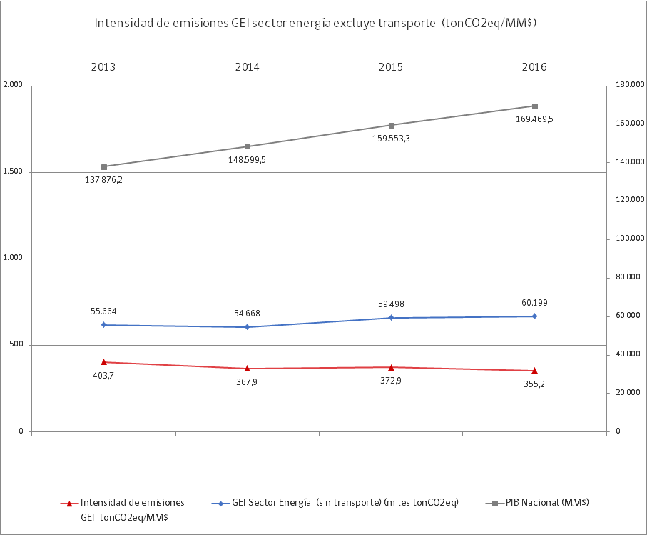 | Año | GEI Sector Energía (sin transporte) | PIB Nacional | "Intensidad de emisiones GEI " | ||||