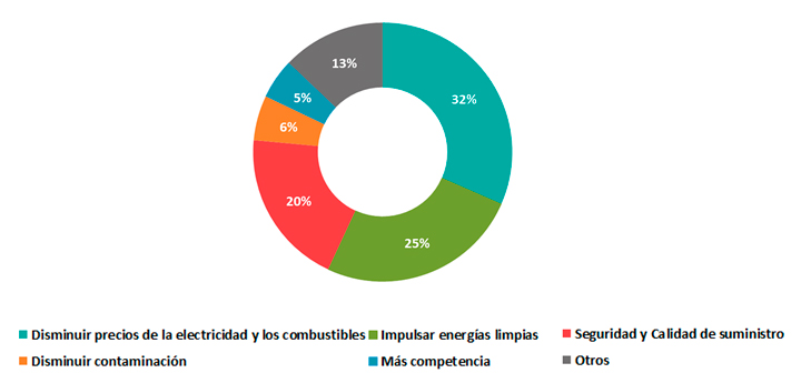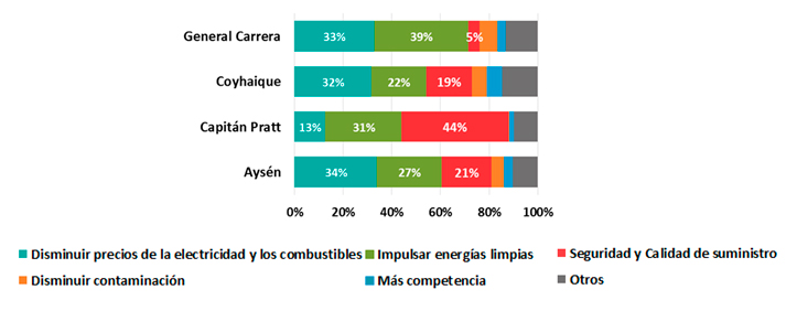 Otros: Lograr una mayor eficiencia en el consumo energético (3,7%); Asegurar que el desarrollo energético favorezca el desarrollo local definido por las comunidades (1,9%); Cambiar el actual monopolio eléctrico con la entrada de nuevos actores y más competencias (5%); Integrarse energéticamente con el resto del país (1,1%); La construcción de nuevos proyectos de generación eléctrica (3,8%), Disminuir la contaminación provocada por el mas uso de la leña (5,6%), Otro (0,7%); No sabe (1,2%); No responde (0,5%).