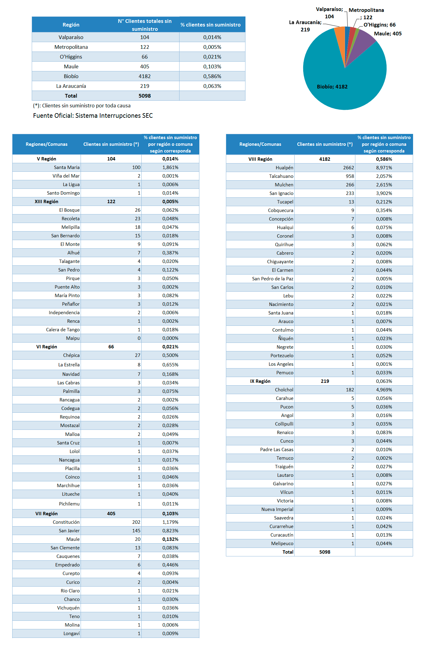 ,En el sector distribución existen cerca de 5.098 clientes sin suministro en la regiones afectadas por los incendios, por causas de diversa naturaleza.