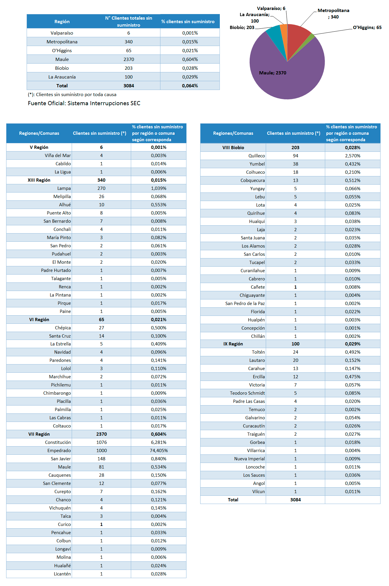 ,En el sector distribución existen cerca de 3.084 clientes sin suministro en la regiones afectadas por los incendios, por causas de diversa naturaleza. Se adjunta la tabla con las comunas que a la hora presentan clientes sin suministro, junto con el porcentaje en función al total de clientes regulados de la misma.