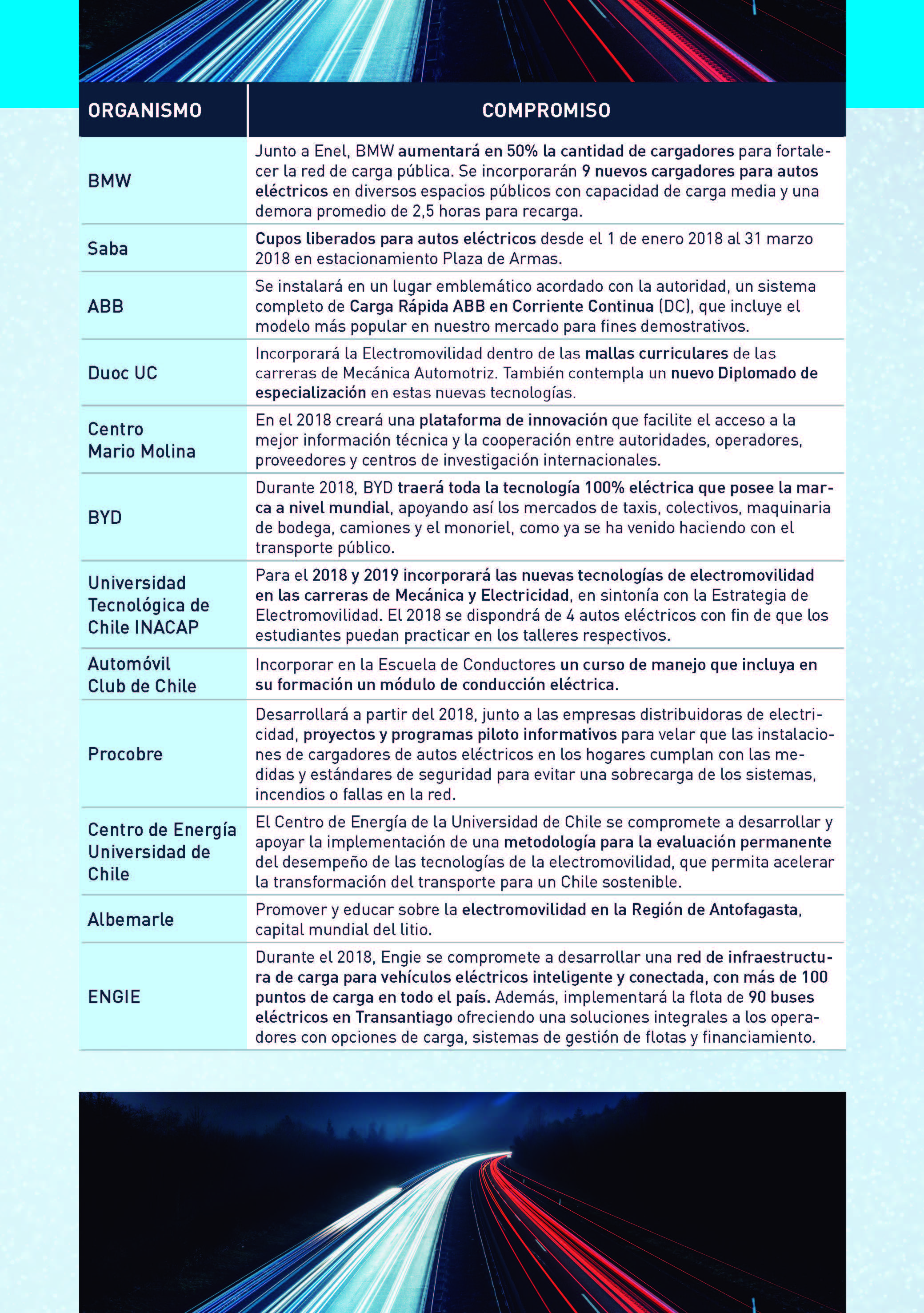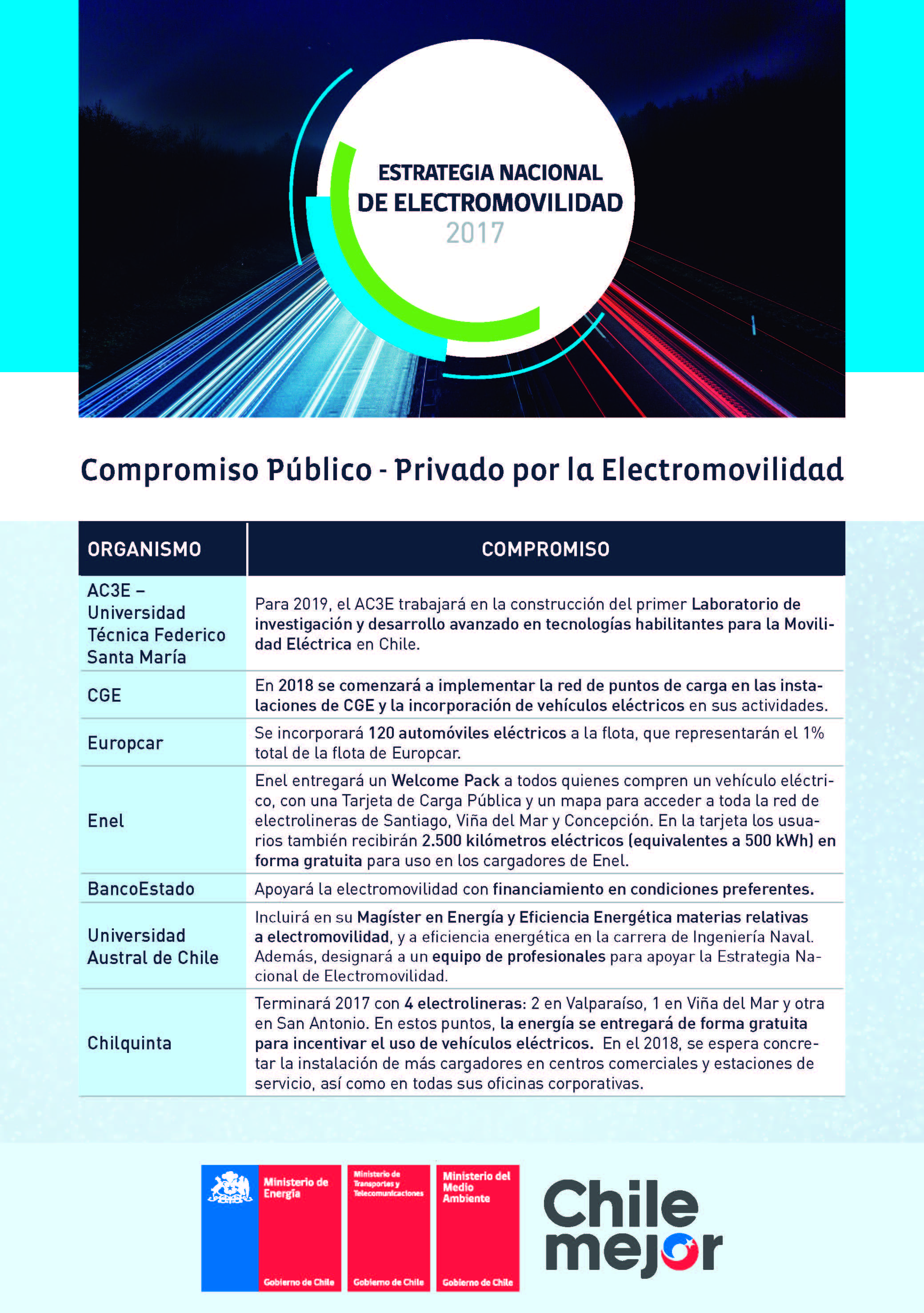 ,En el marco de esta estrategia, veinte entidades públicas y privadas han querido ser parte de esta transformación, suscribiendo el Primer Compromiso Público Privado por la Electromovilidad. Dicho compromiso apunta al desarrollo de actividades, proyectos o iniciativas que en el corto plazo contribuyan a difundir en Chile las ventajas de la movilidad eléctrica y promover este cambio en el transporte nacional. Entre ellas, destacan medidas de formación académica, entrega gratuita de electricidad de carga, y aumento de electrolineras en el país.