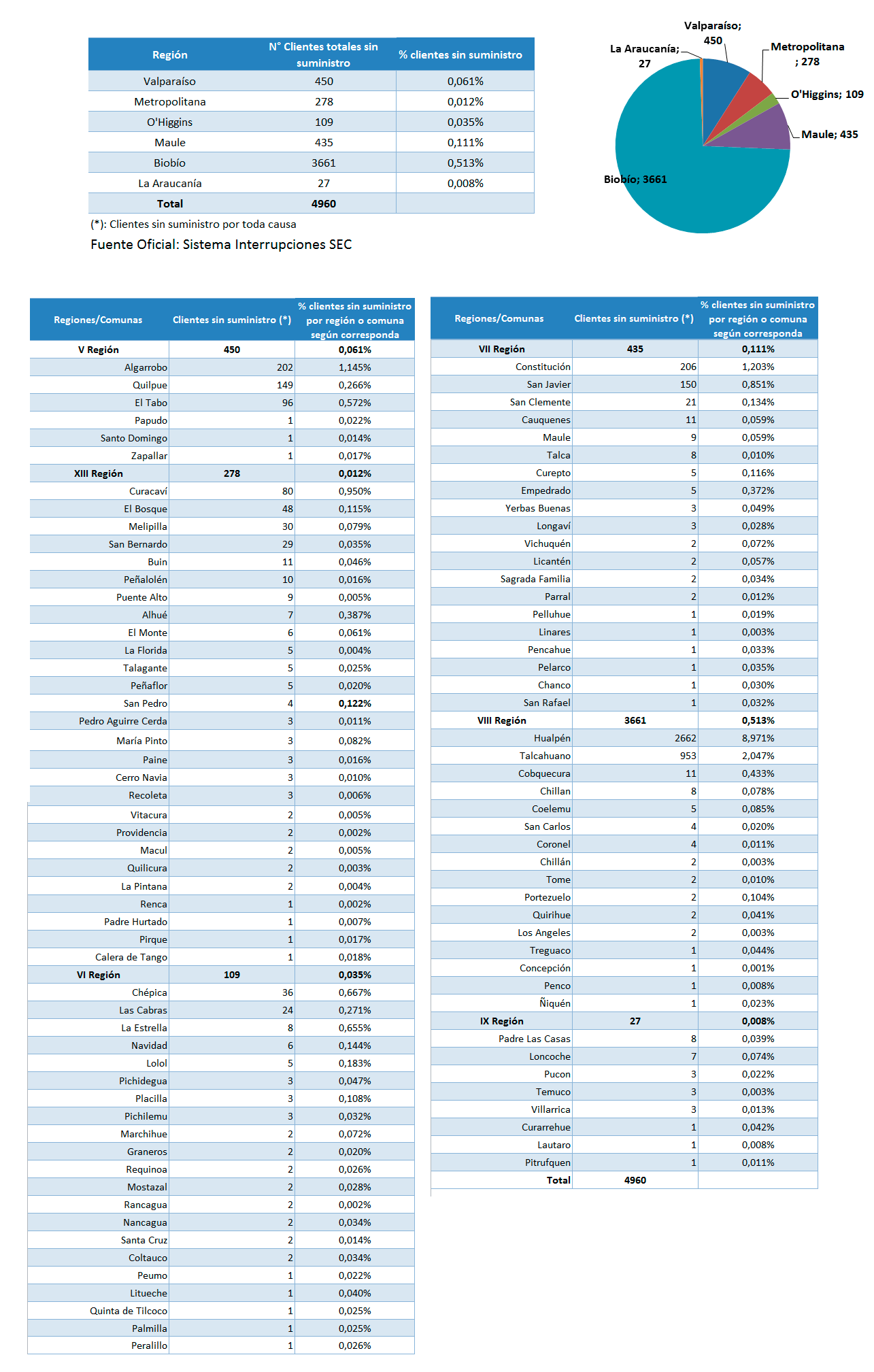 ,En el sector distribución existen cerca de 4.960 clientes sin suministro en la regiones afectadas por los incendios, por causas de diversa naturaleza.