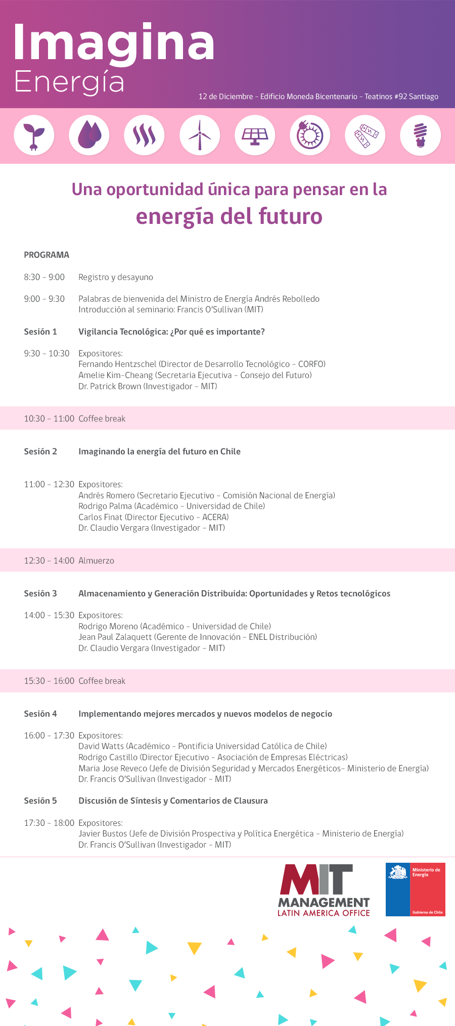 Una oportunidad para analizar y conocer las tecnologías que revolucionarán la energía del futuro. Esta es la propuesta del próximo seminario Imagina Energía, organizado por el Ministerio de Energía y la Escuela de Administración del Instituto Tecnológico de Massachusett. Durante todo un día de presentaciones y conversación, académicos y expertos de alto nivel internacional analizarán las últimas tendencias tecnológicas en materia de energía y generación distribuida, y cuáles son sus prospectivas en nuestro país. Te invitamos a participar de forma gratuita en este encuentro.