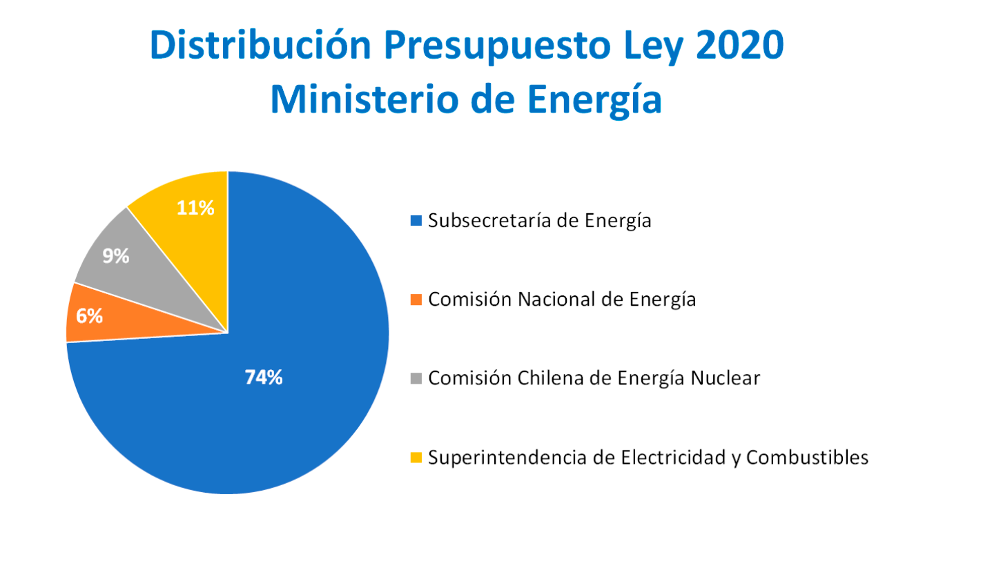 La Ley de Presupuestos del Sector Público para el año 2020 - N°21.192, asigna a la Partida 24 - Ministerio de Energía un presupuesto total de M$131.851.340. De este total, M$97.983.329 corresponde al presupuesto del Capítulo 01 - Subsecretaría de Energía, el cual equivale a un 74% del presupuesto total del Ministerio. El 26% restante, concentra el presupuesto del resto de los Servicios que conforman el Ministerio: Capítulo 02 - Comisión Nacional de Energía, Capítulo 03 - Comisión Chilena de Energía Nuclear y el Capitulo 04 - Superintendencia de Electricidad y Combustibles.